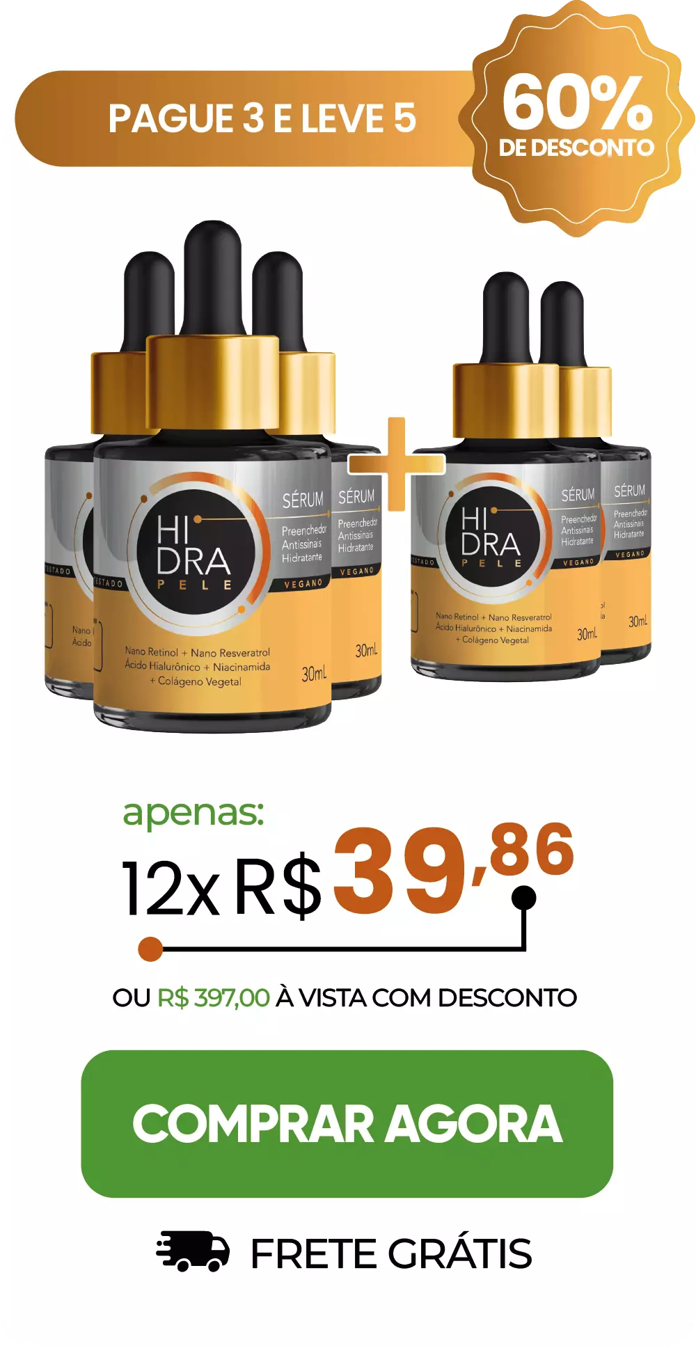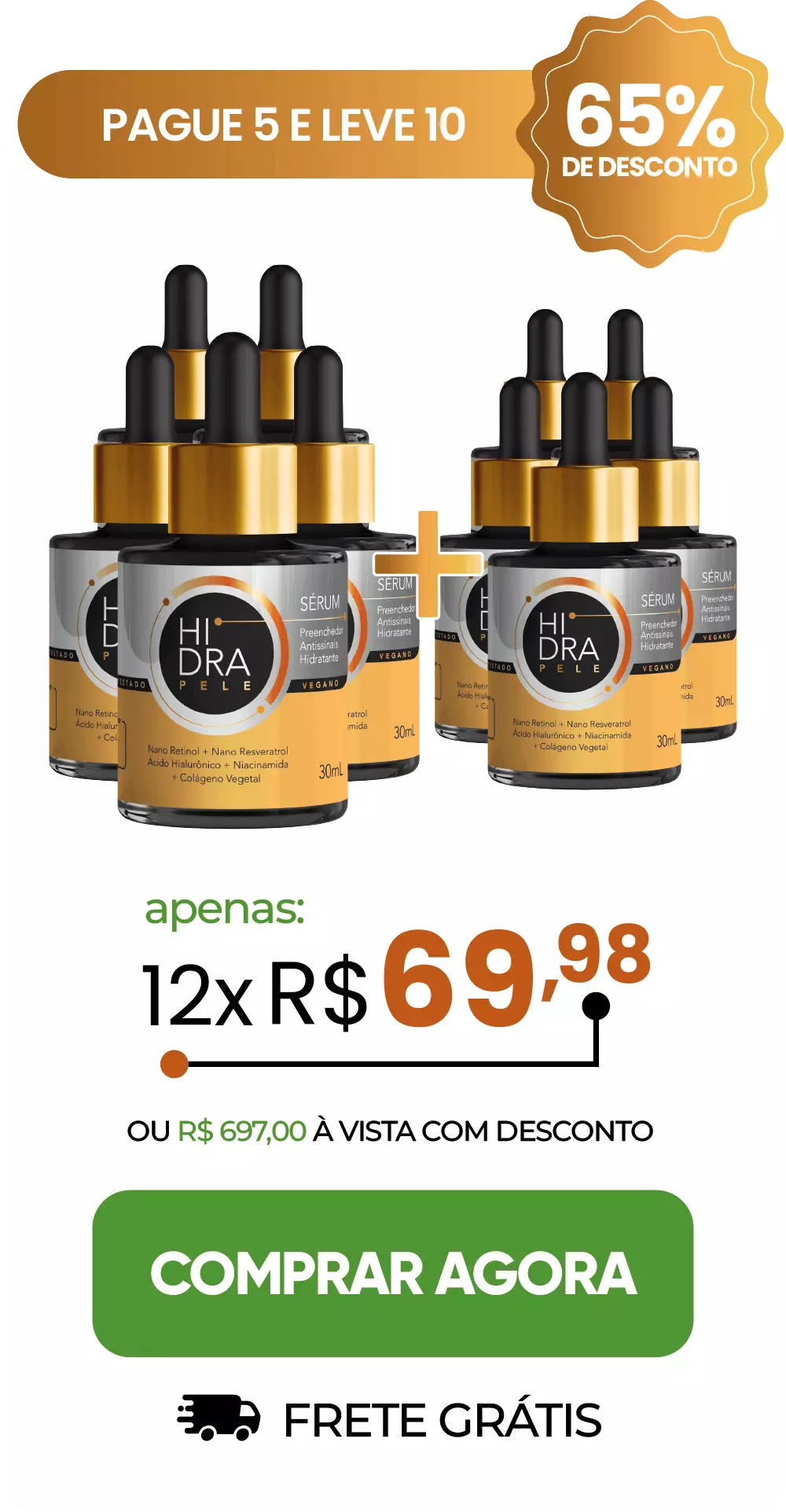 O kit mais recomendado e vendido é o de 5 frascos, uma vez que, apesar de se obter resultados imediatos com o uso do Sérum, os melhores benefícios são obtidos com o uso contínuo do produto.